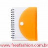 Bloco de anotações ecológico com caneta. Capa com símbolo reciclado na parte superior e espiral preto lateral(verso liso), primeira folha colorida seguida de aproximadamente 70 folhas brancas pautadas e última folha papelão branco. Possui suporte elástico com caneta papelão de clip e ponteira plástica.