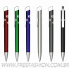 Lapiseira metal inteira colorida com detalhes prata. Clip metal com a ponta do acionador na cor da peça, parte inferior com dois anéis prata. Aciona por clique.