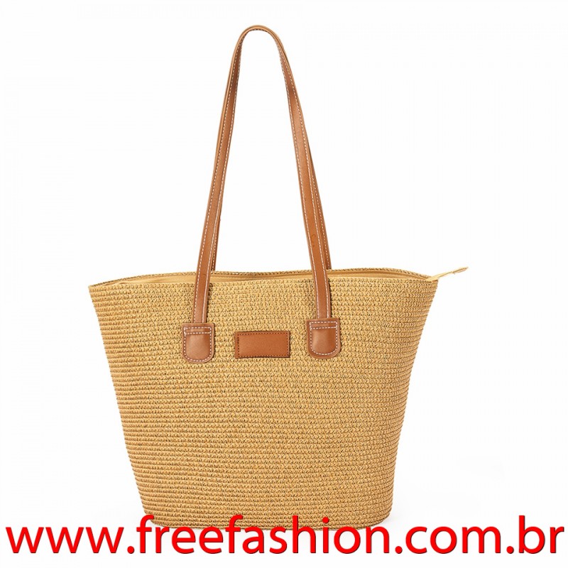 Bolsa em fios de papel torcido costurados com linha de nylon e fechamento em zíper. Possui compartimento interno com bolso compacto, além de alças e detalhes em couro sintético, incluindo plaquinha frontal costurada.