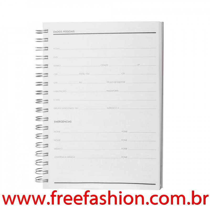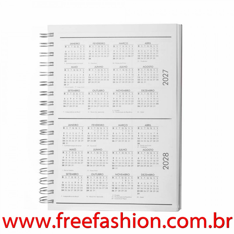 Contém folha de dados pessoais, folha com calendários de 2025 à 2028 e espaço para anotações mensais.