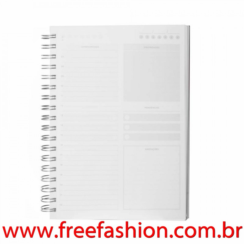 Caderno planner com capa rígida em PU de 2mm em formato espiral. Contém 90 folhas brancas de 95g/m². Folhas estruturadas em formato de planner para anotações e gestão da rotina.